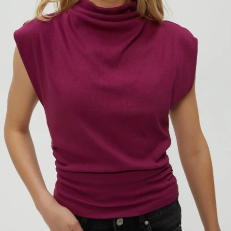 Amara Mock Neck Power Shoulder Top in Ruby