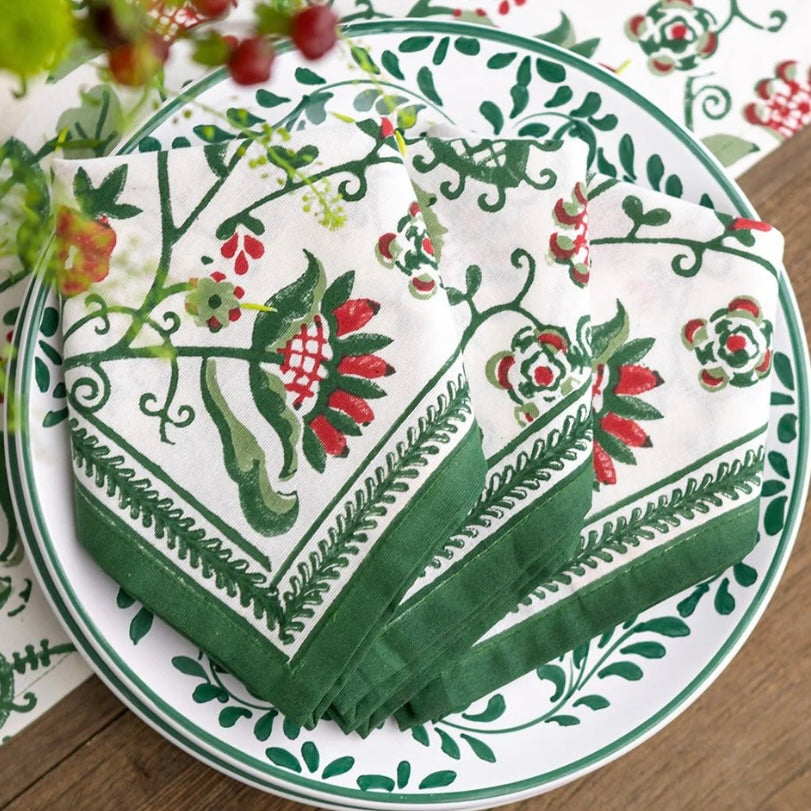 Complete your holiday table with our Con Con Red & Green Napkins. Hand block printed with intricate floral designs in shades of red and green, these cotton napkins blend artisanal detail with everyday practicality. Pair them with our matching table linens for a coordinated, festive look.