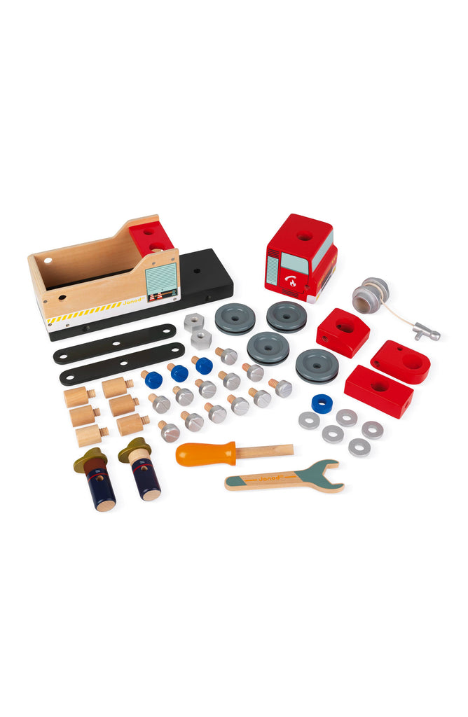 For children aged 3-8 years. Wooden toy. 2 toys in 1: a construction game to reassemble a magnificent fire engine using the many nuts, plates and screws provided. Once assembled, children can let their imaginations run wild to create grand adventures with this fully-fledged toy! Comes as 45 pieces, with 2 tools and 2 fire fighters and instructions for assembly.