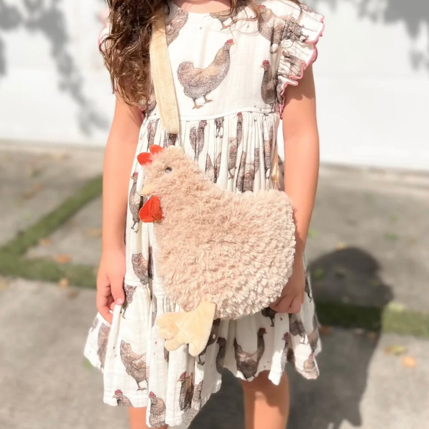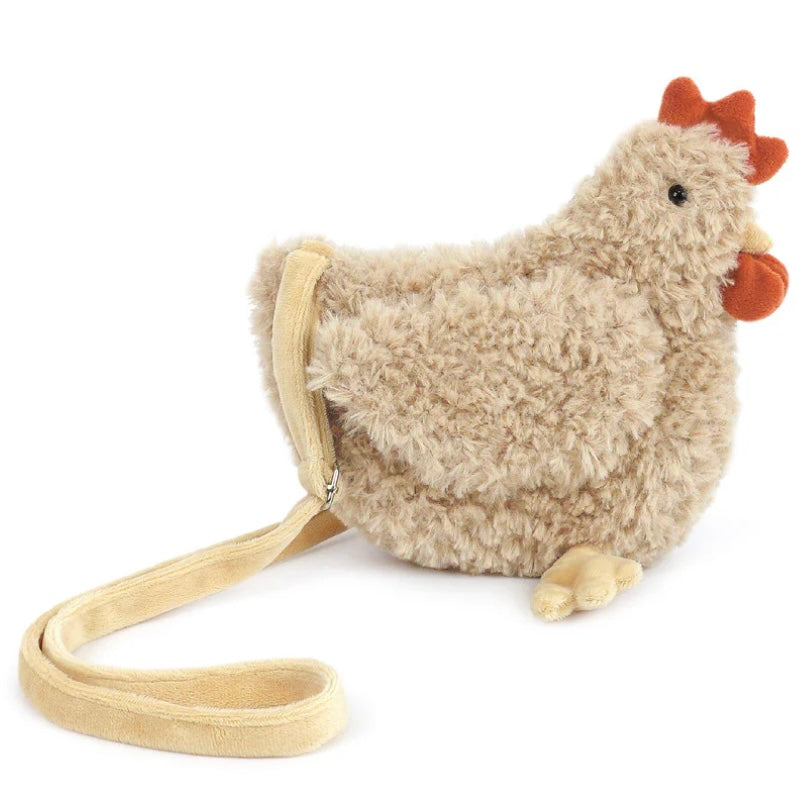 Introducing Hazel Hen Purse clucking, cute and ready to strut! This adorable plush purse features super soft textured fur, a secure zipper closure, and adjustable strap for comfortable wear, making it the perfect blend of fun and fashion. But this isn't just any purse; it's the ultimate cuddle-meets-carry adventure! Ideal for your little one's adventures, it provides a cozy spot to stash their snacks and treasures. Whether you're gifting it or rocking it yourself, this quirky statement piece is sure to turn heads and collect tons of compliments. Get ready to ruffle some feathers and make every outing extra magical with this one-of-a-kind accessory!
