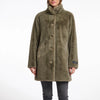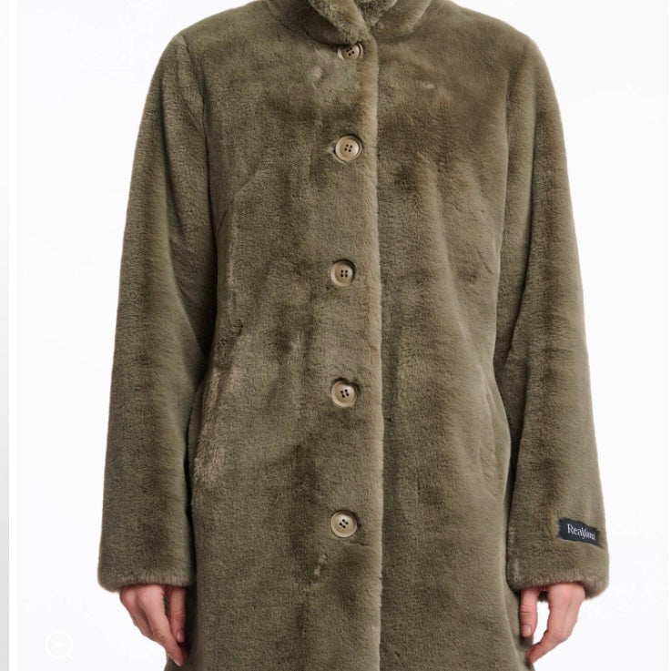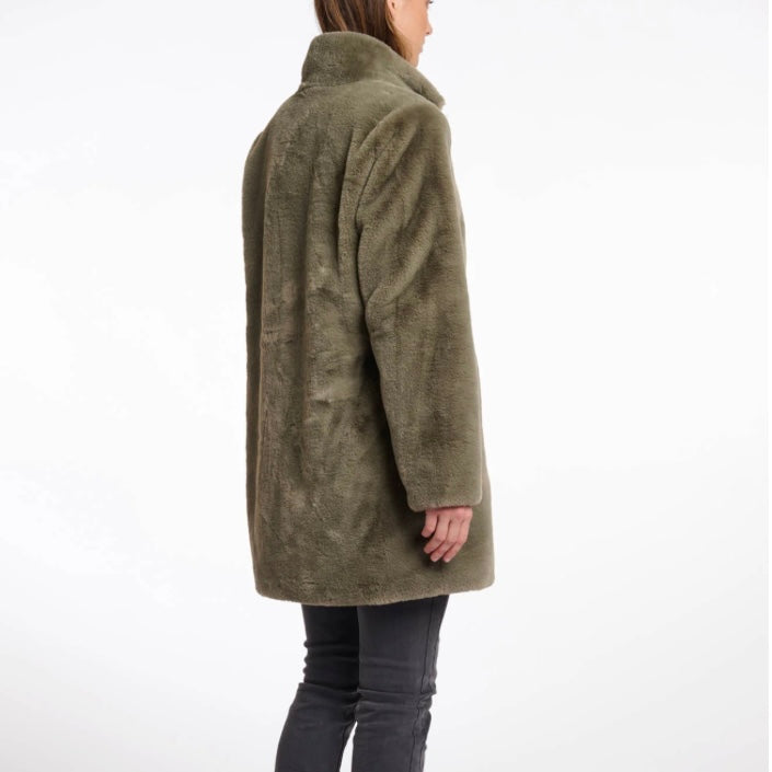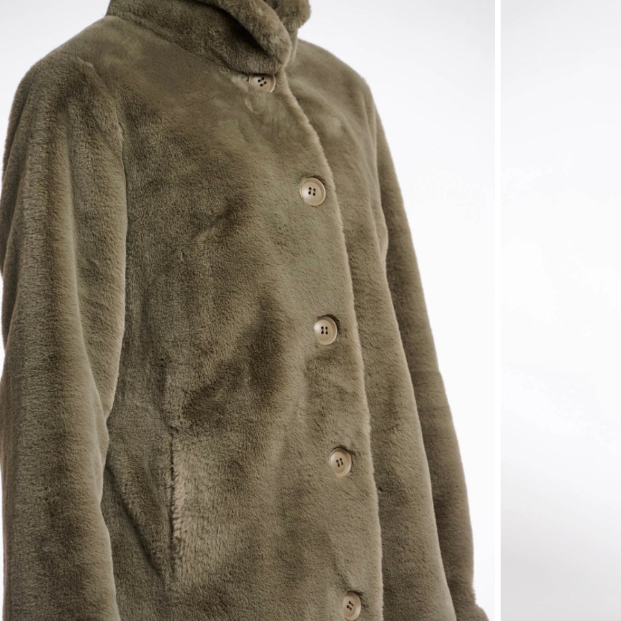 The Nonna coat has a medium-length cut with a high neck collar, button up fastening and two hidden pockets on the sides. It's the perfect piece to snuggle up in and feel warm and stylish. You won't want to take this coat off. The 'Real faux' label on the sleeve can be removed.