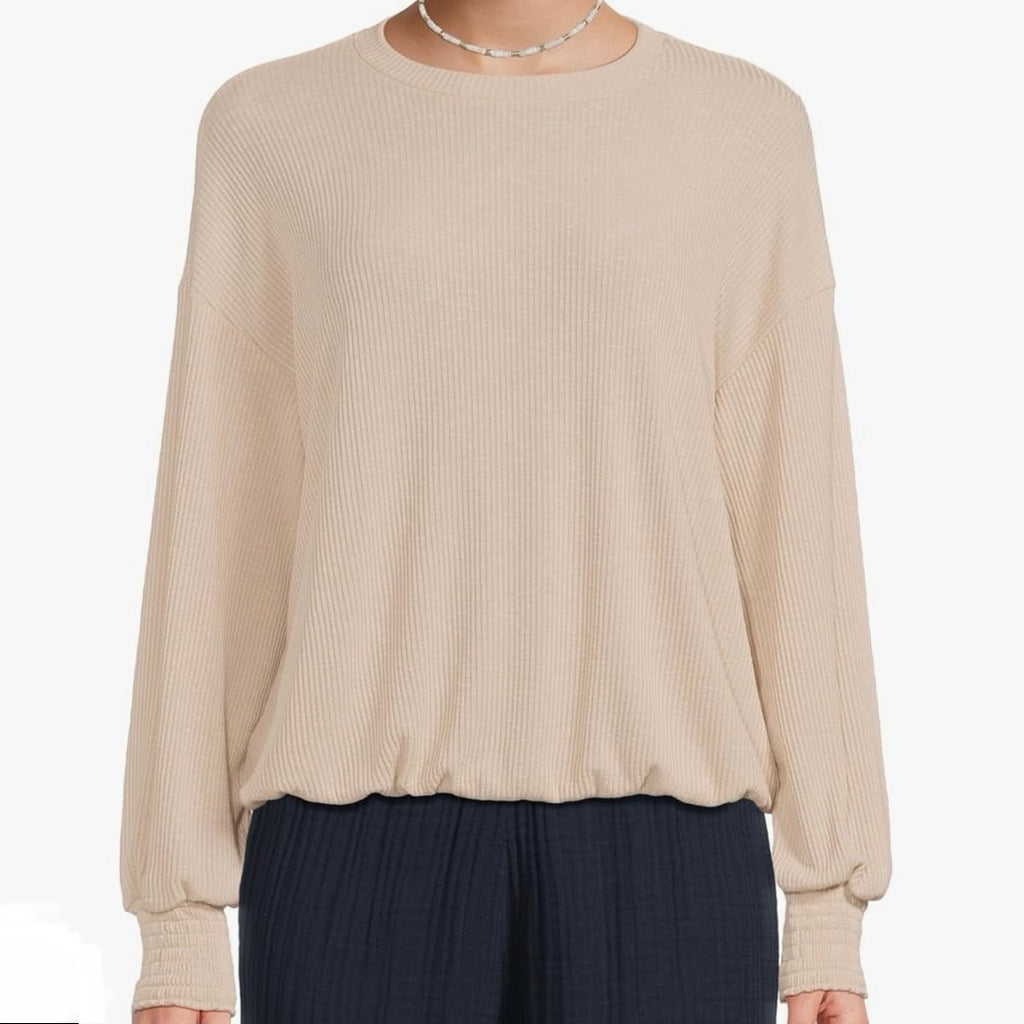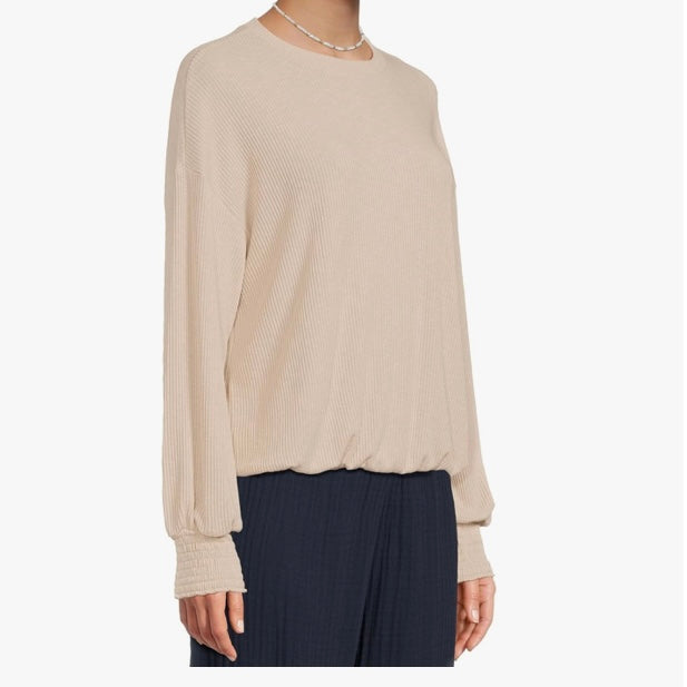 Tia is the top that’ll you’ll get excited to wear. With a crew neckline, long sleeves with smocking at the cuffs and a cozy ribbed body, Tia offers a more elevated feel. It features bubble hem with an easy fit making this perfect for pairing back your favorite denim or the Avery Cargo Pant.