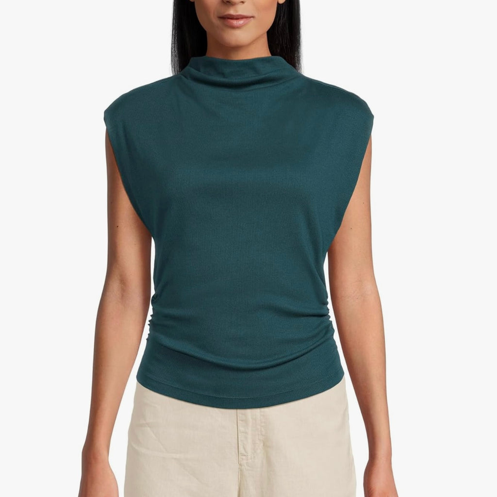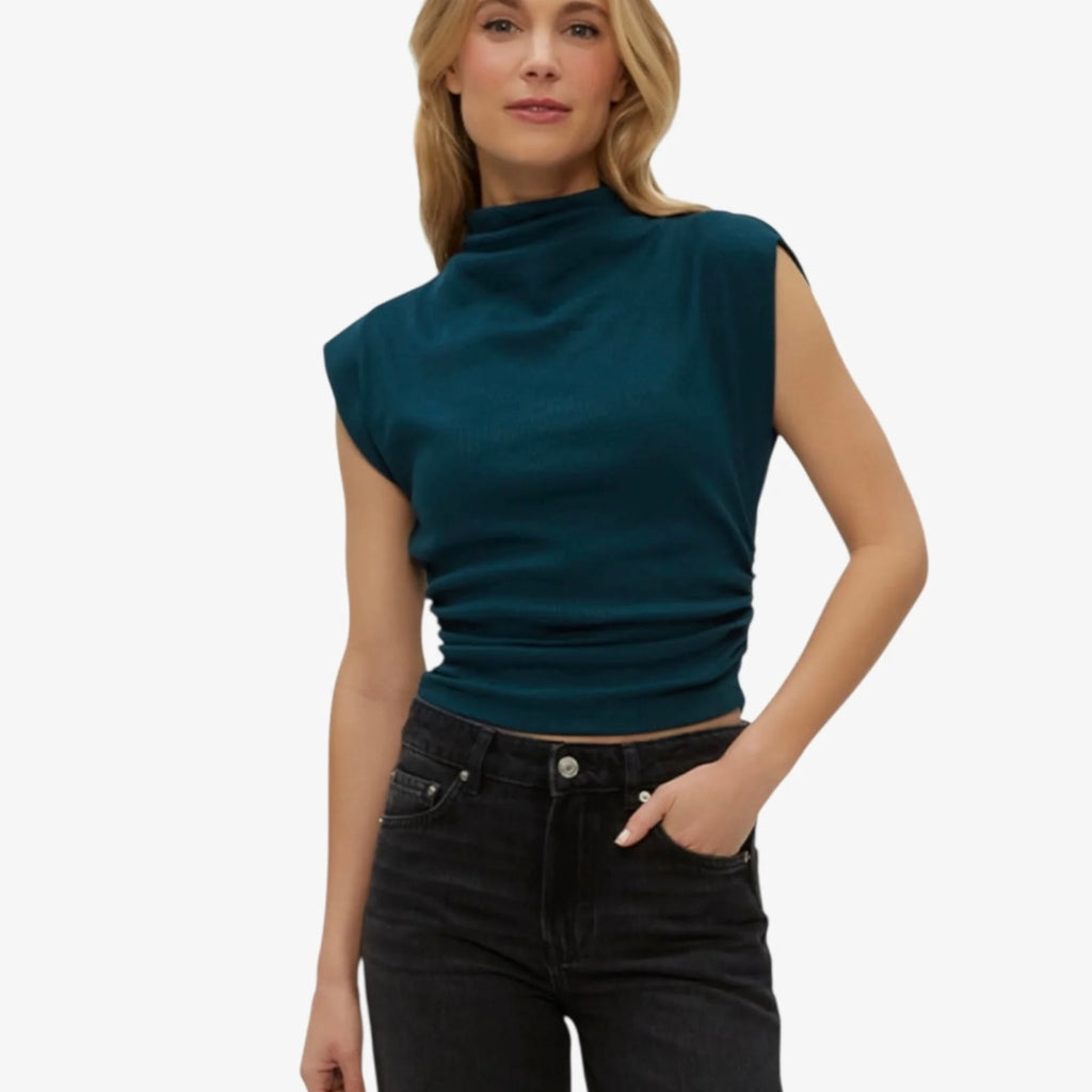The day-to-night top. Amara has a power shoulder, mock neck, and side ruching with a cropped silhouette that hits at the waist of high rise bottoms. Made from our soft Ultra Rib fabric that washes well and keeps it's shape throughout wearing.
