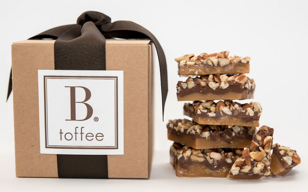 Enjoy our naturally gluten free B. Toffee in our custom Kraft Boxes wrapped with chocolate brown ribbons. Each batch is handcrafted to perfection with rich savory butter, sweet domestic sugars, premium Guittard Milk and Callebaut Dark chocolates, topped with superior quality roasted Pecan Nuts.