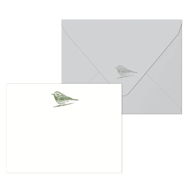 A pack of ten flat notecards with eucalyptus green bird letterpress printed at the top. Perfect for a little message with a matching designed envelope!