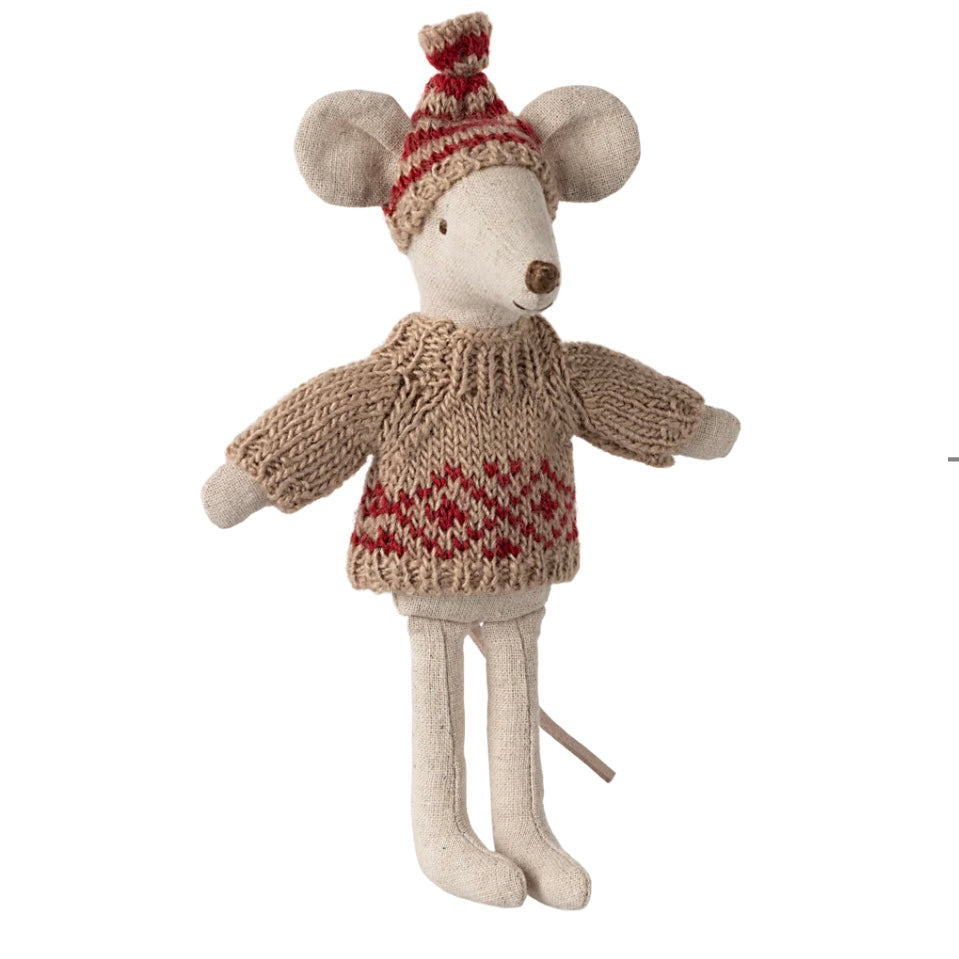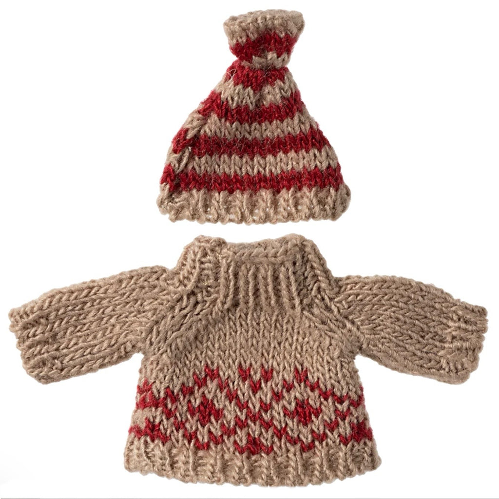 A soft knitted sweater for the cold wintertime. It has a beautiful pattern inspired by the old traditions of knit in Scandinavia. The tiny hat will keep the ears warm as well. This sweater fits mice in size mum/dad and grandma/grandpa perfectly