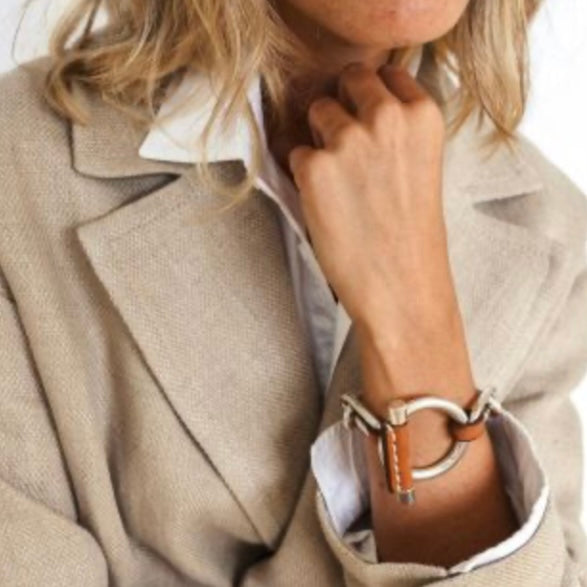 This exquisite chain bracelet by CXC is crafted from a zinc alloy, various metals, and iron, with a luxurious silver-plated finish. It features a camel-colored leather detail that has been vegetable-tanned, edge-dyed, and hand-stitched for a unique touch. Imported and backed by a warranty, it's a versatile one-size accessory that adds a touch of elegance to any outfit. Each piece of jewelry by CXC is designed and handcrafted in our workshop in Spain.