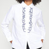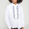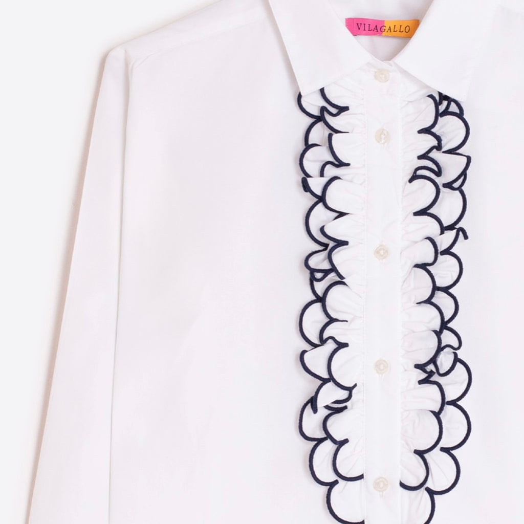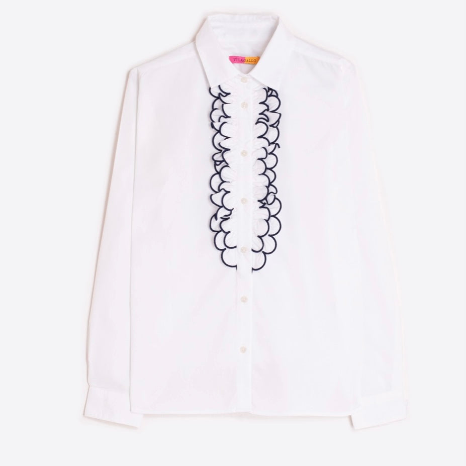 White poplin shirt made of 100% cotton. Classic collar and visible front button closure. Vertical front ruffles with navy blue embroidered edges. Long sleeves with buttoned cuffs. Straight fit