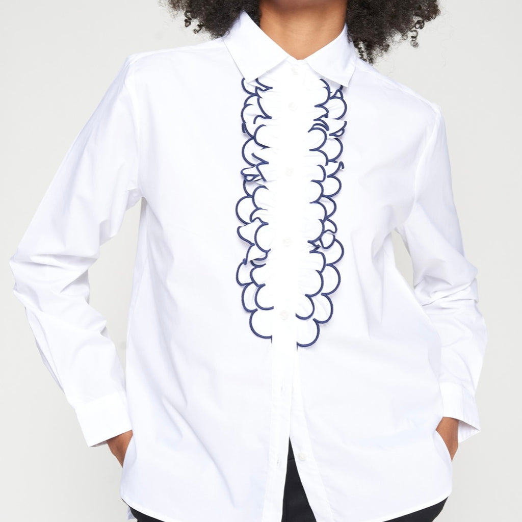 White Ruffle Shirt with Blue Trim